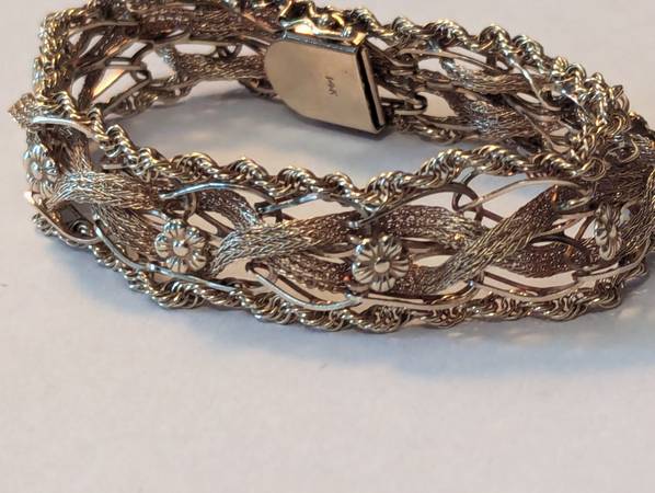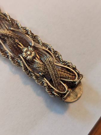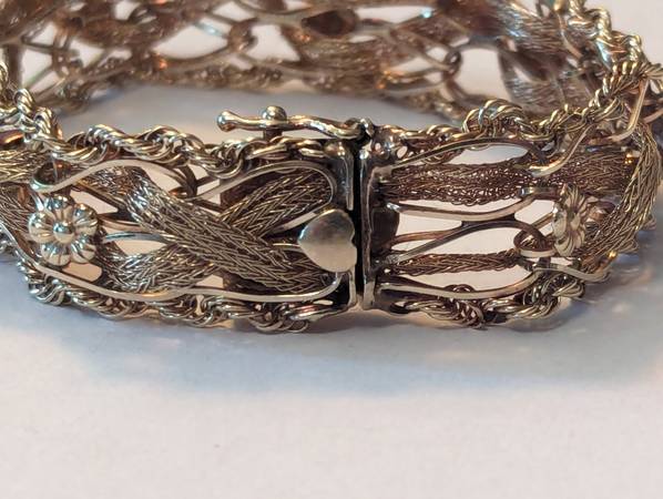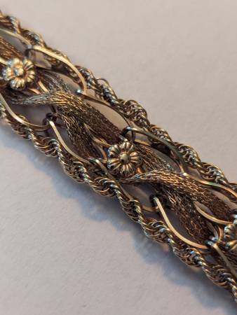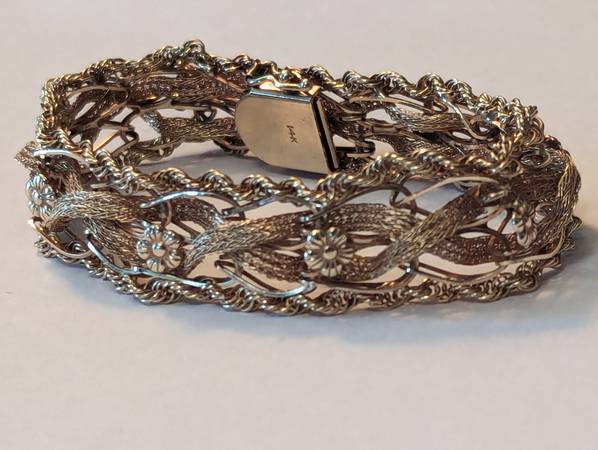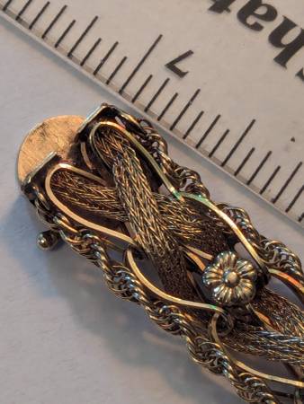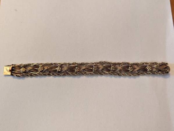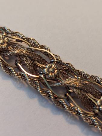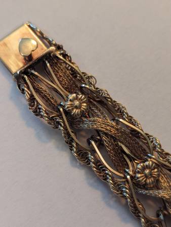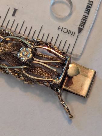 This beautiful bracelet is over 100 years old and in excellent original condition. It is a combination of yellow and rose gold. The weight is 20.5 g. My price is $2,350. That price is 100% firm. The only trades I would accept would be United States silver coins that are 90% silver and the weight value equates to my price for this bracelet. It really is a stunning piece that nobody else will have. So if you have the perfect girl in your life that deserves such a beautiful piece like this, send me a message and let's make it happen. This piece is 100% guaranteed to be authentic. It'll easily pass any and all examinations.
