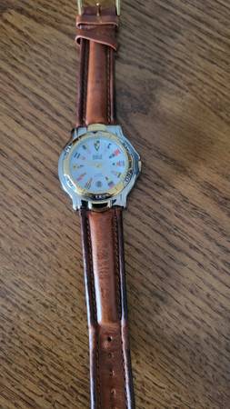 Nice men's watch with leather band. Water resistant - 3ATM. Stainless steel back. Also has the date. Just needs a battery.