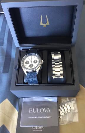 Fifty meter water resistance, sapphire crystal, stunning color dial with several layers of depth which makes the watch exceptionally interesting to look at. Very detailed interesting engraving on caseback tribute to original Bulova worn on the moon