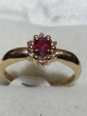 Beautiful NEW 14K solid yellow gold ring with a ruby and 6 small clear diamonds. It is a size 7 3/4, weights 3 grams. Some pics enlarged to show detail. thanks for looking comes with new ring box