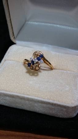 New fancy 10K solid yellow gold diamond and sapphire ring. size 6.5(can be re-sized by jeweler) It contains 4 sapphires and 3 diamonds. Ring stamped 10k.... some pictures enlarged to show detail....