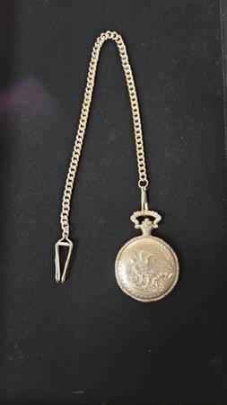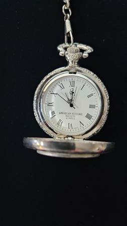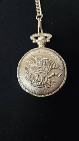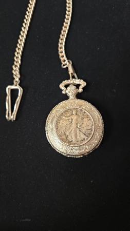 American Historic Society Pocket Watch 1943 Liberty Half Dollar on one side, Eagle on the other side. Approx. 1.75" diameter. This watch needs a battery. (If you know how to install the battery, please message me. I do not want to mess up the watch). This watch is silver in color. A beautiful conversation piece. Excellent condition.