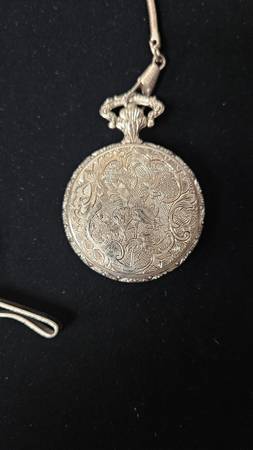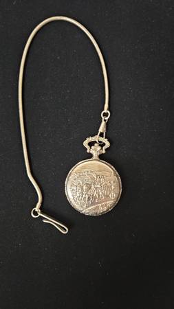 Citron Antimagnetic Stagecoach Pocket Watch. This is a working watch. Approx. 2" in diameter. Silver in color. Adorned with a raised stagecoach. A beautiful piece. Excellent working condition. Ask...