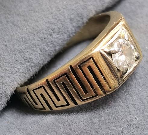 Pre-owned in excellent condition and very good looking. 14 k yellow gold mounting is accented with a Greek Key pattern. It is a size 10 and weighs 3.7 grams. The Diamond is natural and is 1/2 carat. It is an SI2 clarity and G color, round brilliant cut.