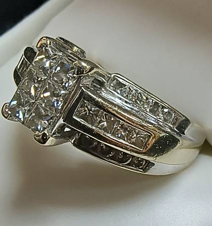 Very beautiful ladies ring that could be worn as either a cocktail ring or an engagement ring. Contains a stunning combination of 2.10 carats of Princess Cut and Round Brilliant Natural Earth Mined Diamonds. Clarity is VS2-SI1, Color is H, and the ring weighs 7.9 grams. The ring is a size 8. Super Attractive with a modern style!