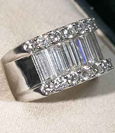 Never worn in brand new condition and comes complete with GIA paperwork and a stated value of over $9,000. Contains over 4-1/2 total carats of brilliant, natural, earth mined, baguette and round diamonds set in 14 karat white gold.