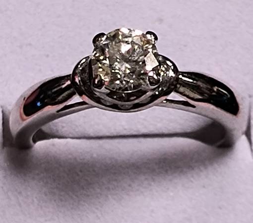 This is a very beautiful ladies natural diamond engagement ring that you must see in person to appreciate how much it really sparkles! The centerstone is a round brilliant cut 5/8 carat natural diamond that is si1 clarity and G color. It is accented around the head with another quarter carat of natural small round brilliant diamonds raising the total care weight to 0.87 carats. The band is 14 karat white gold and is a size 6 and is a nice sturdy band.