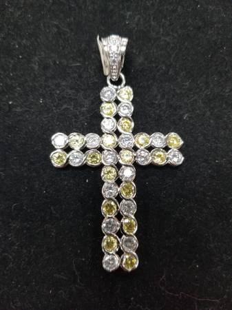 Sterling Silver and set with yellow and white stones. 3 inches high. 27 grams, very good weight. Many other religious charms now on sale. If interested please call or text 7two4 746 9190. No emails.