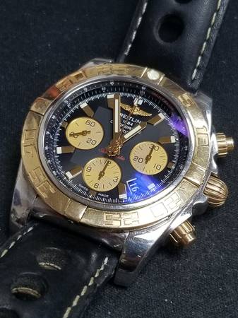 Exceptional High Quality large 44mm size Breitling Chronomat Chronograph. 18 karat gold and stainless steel. Model CB0110. Excellent condition and working perfectly. Recently serviced. Includes the band that is on it in the pictures and the Breitling stainless steel & 18 karat gold bracelet. If interested please call or text 7two4 746 9190. No emails.