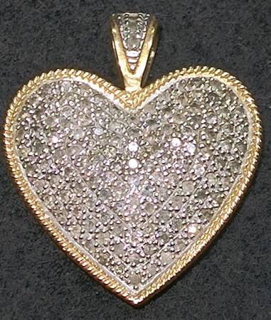 Very pretty 14 karat yellow gold heart pendant set with 1 CtTW genuine natural diamonds. Slightly larger than a quarter in size it weighs 4.6 grams. Price is firm.
