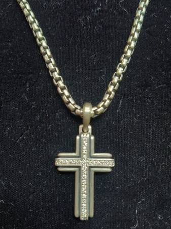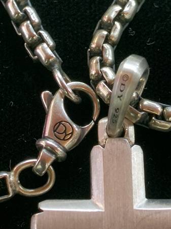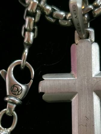 This is an exceptionally nice and very high quality David Yurman genuine diamond cross and chain set! Both pieces are 0.925 sterling silver and are properly hallmarked as you can see in the pictures. The chain is 22 inches long, is 3.5mm diameter, and with the cross weighs over 42 grams. The cross is 1-1/2" high with 33 small diamond accents.