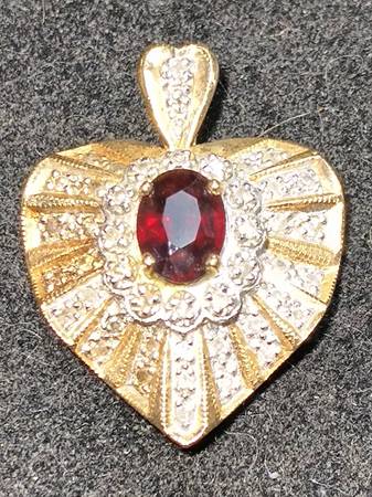 Very pretty 14 karat yellow gold heart pendant set with genuine natural diamonds and a bright red garnet in the center. Slightly larger than a quarter in size it weighs 5.6 grams. Price is firm.