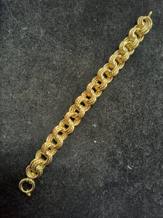 This is a beautiful, fancy, open link 14 karat yellow gold bracelet. It measures 7.5 inches long, is approximately 14mm wide, and weighs 11.5 grams. Price is firm.