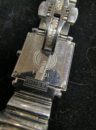 Genuine and authentic Fendi ladies wrist watch. Stainless steel case and bracelet, quartz movement, mother of pearl and black guilloche dial. Pre-owned in excellent condition and working perfectly. Super attractive and very stylish as well as being fine quality and an exclusive brand!