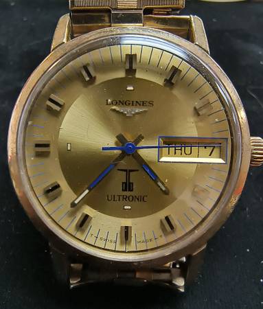 Genuine and authentic Longines Ultronic Men's wrist watch. Gold filled case with stainless steel back and matching bracelet, tuning fork movement, and Day Date dial. Pre-owned in excellent condition and working perfectly. Super attractive and very stylish as well as being fine quality and an exclusive brand!