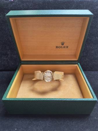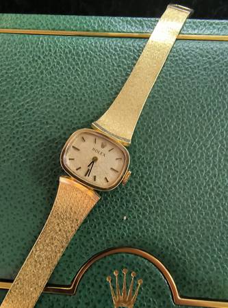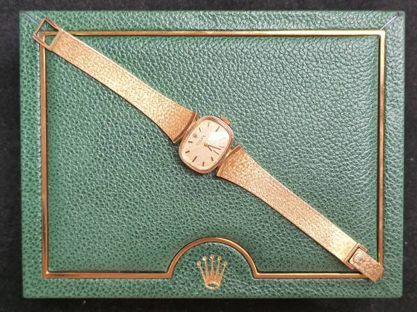 Guaranteed 100% genuine and authentic ladies 14 karat gold Rolex dress wrist watch. Serviced, working perfectly, and keeping accurate time. 6" bracelet length. Manuel wind. 17 jewels. Model 8232.