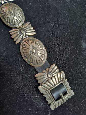 Very good looking vintage silver concho bracelet with matching silver buckle on leather strap. Circa 1976. If interested call or text 7two4-746-9190 no emails.
