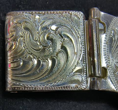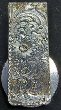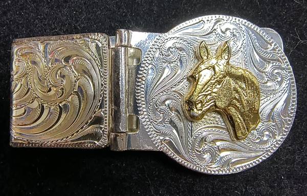 Very fancy money clip from renowned artists at Montana Silversmiths. Features a gold highlighted Thoroughbred Horse on a deeply embellished silver Legacy hinged folding money clip. 2 1/4 in Long. If...