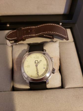 Purchased new at a local jeweler...42mm, 2 straps; black rubber and brown leather; wood box included, currently on the black rubber strap...it wears like a 44mm, IMO