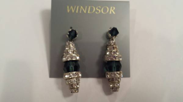 Navy and rhinestone drop earrings, pierced, paid $81 at local bridal shop, selling for $30. Wore with a navy Mother of the Bride gown. Showed well on dark hair because of the rhinestones. Cash only,...