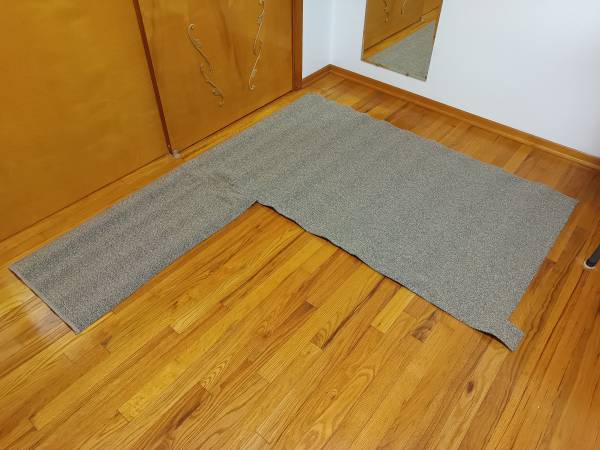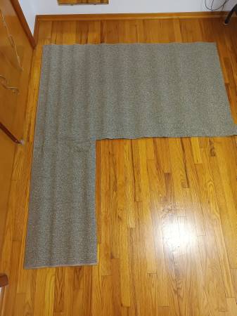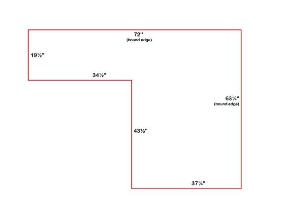Was part of a larger area rug that was cut to fit a small space. L shape. Main part is roughly 3'x5', see diagram. Bound on two sides, and the bound sides are roughly 6'x5'.