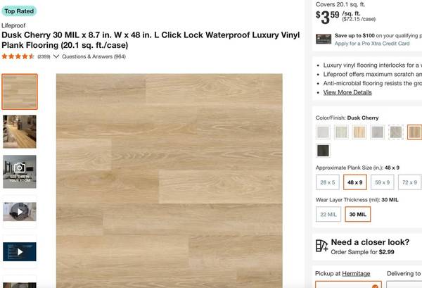 7 mm thickness x 8.7 in. width x 47.6 in. length; 30 mil wear layer