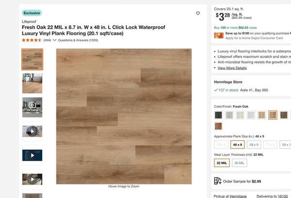 7 mm thickness x 8.7 in. width x 47.6 in. length; 22 mil wear layer