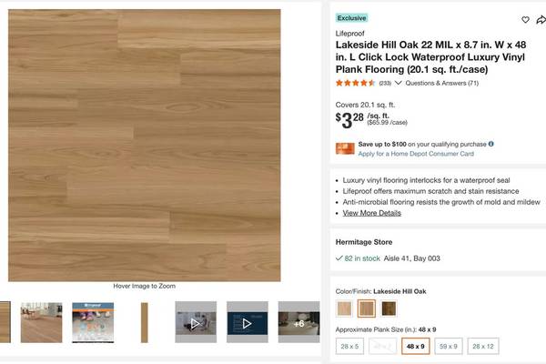 6.5 mm thickness x 8.7 in. width x 47.6 in. length; 22 mil wear layer