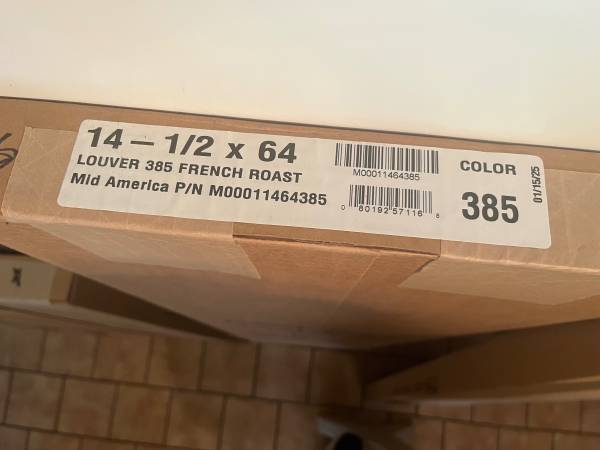 Mid American brand exterior shutters- ordered too many and did not use the whole order and have 5 sets left- still in boxes unopened, tape intact: 3 sets 15 x 64" Color: French Roast (Brown) 2 sets...