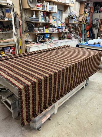 This blind is made of yarn and wood. It can be raised up and down. 105 inches wide by 68 inches tall and is in excellent condition