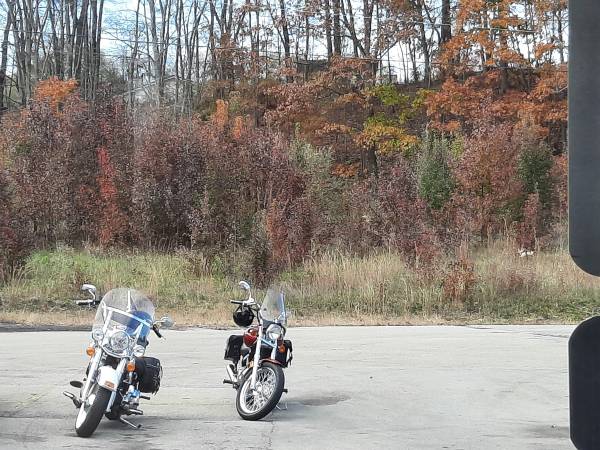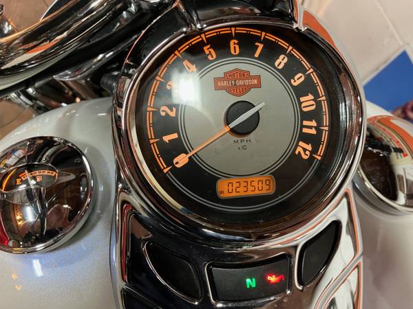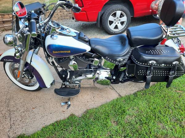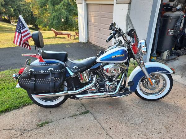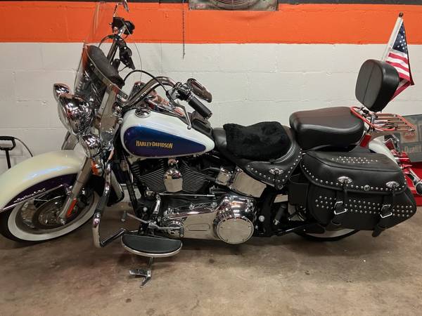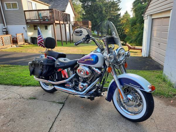 Color is white ice / black ice (looks blue and white) color changes in sunlight. Clean, no dents, dings, or scratches. Lots of chrome. chrome laced wheels with fat white wall tires, , backrest, luggage rack, maintenance is up to date. Excellent running condition. inspected till 6/26. Always garage kept. Also included are the factory mufflers, a low-rise seat, and spare windshield.