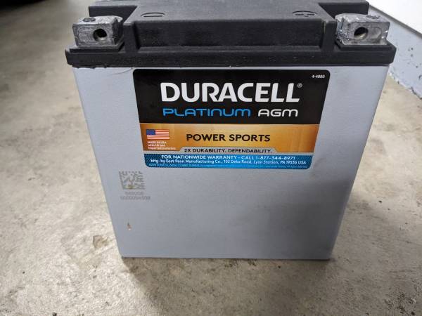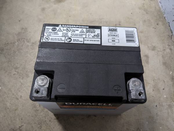 Duracell EXT30LA AGM battery, used 2 seasons, kept on a tender over the winter. I switched out to a larger (reserve capacity) battery this year, and no longer have a need for this. Feel free to...