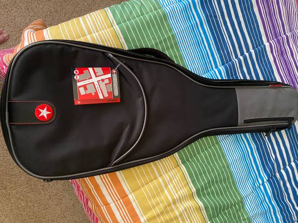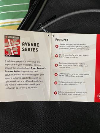 New, with tag. Road Runner electric guitar padded soft case/bag. $70 new at Guitar Center. My price is $35 cash (half off). Not deep enough (thickness) to fit a traditional acoustic guitar.