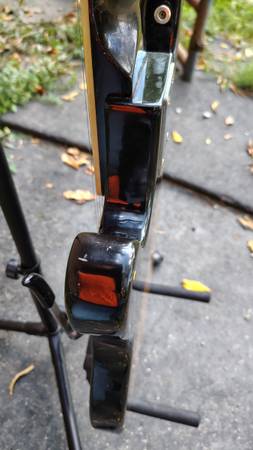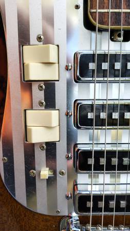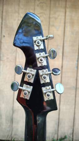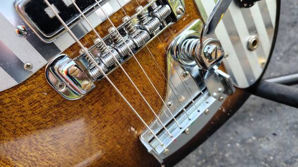 No case. I believe Teisco went with the 4x2 headstock and striped pickguard in 1965. Everything works, but one quirk is the tone control works in the reverse of what is normal. I thought it was wired backwards, but I found a schematic online that indicates this is how they were wired. It maybe looks a bit better in the photos than to the eye. Has it's share of nicks and scratches, as expected for being 60 years old, but it presents very well. Did I mention there is no case, and you'll have to come pick it up.