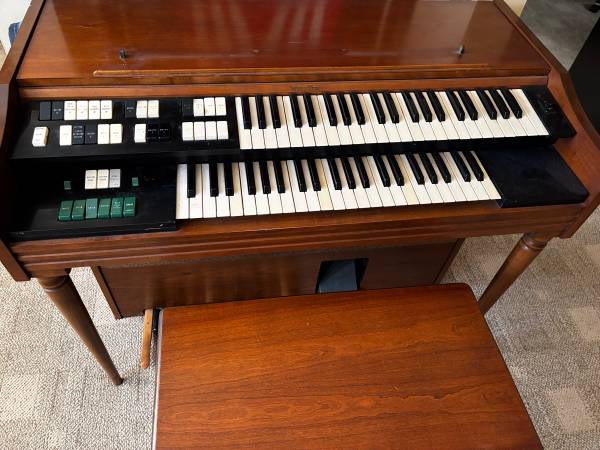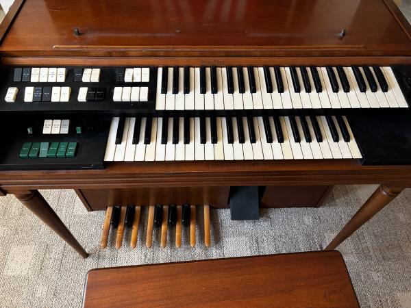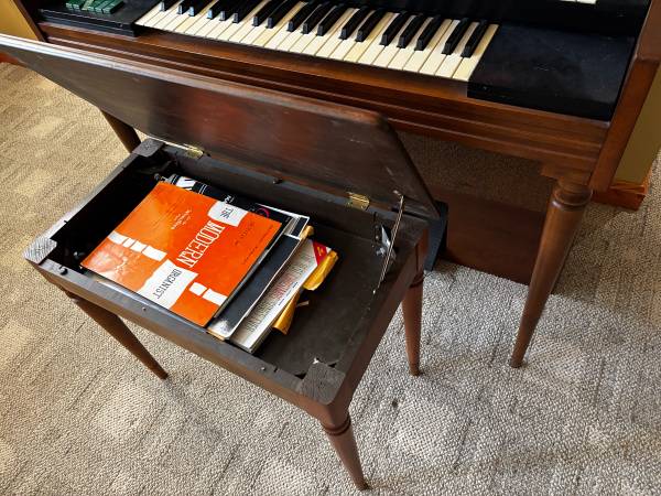 Free for pickup, Wurlitzer organ and bench. Both keyboards are working (one key is stuck). Bass pedals not working. Multiple instrument sounds, including percussion and tempo.