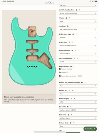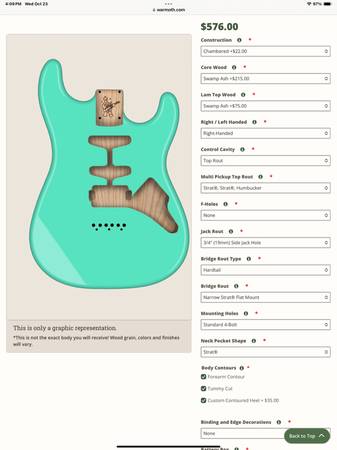 You can see from the pictures taken from the Warmoth site, this would be $576 (body only), plus tax and shipping, and the usual wait time is at least 6 weeks. Selling the body only for $375.