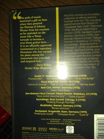 This DVD contains a collection of official archival footage from the '70s including performances from Danish TV 'Gladsaxe Teen Club' (Denmark 1970), the Royal Albert Hall in London (1970), the Beat Club in Bremen, Germany (1970), Don Kirshner's Rock Concert - Palace Theater in Waterbury, CT (1973), Soundstage - Blues Summit in Chicago, IL (1974), Musikladen in Bremen, Germany (1974), and Rockpalast in Germany (1979). Intermixed with the live content is interview footage at Detroit Tubeworks in Detroit, MI (1970). It's a document of Johnny's career in the '70s. 111 minutes.