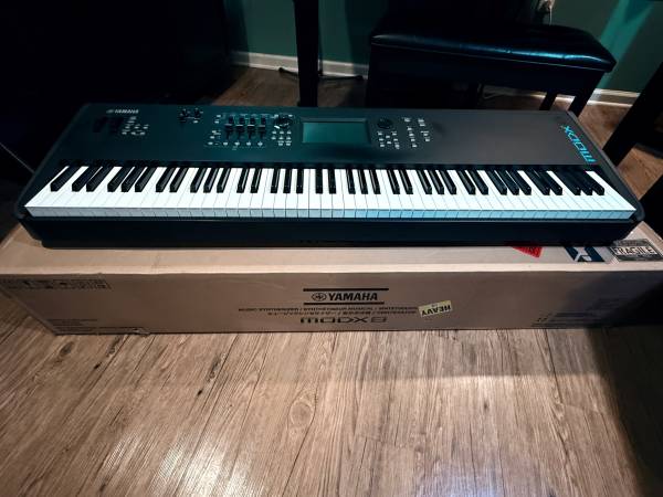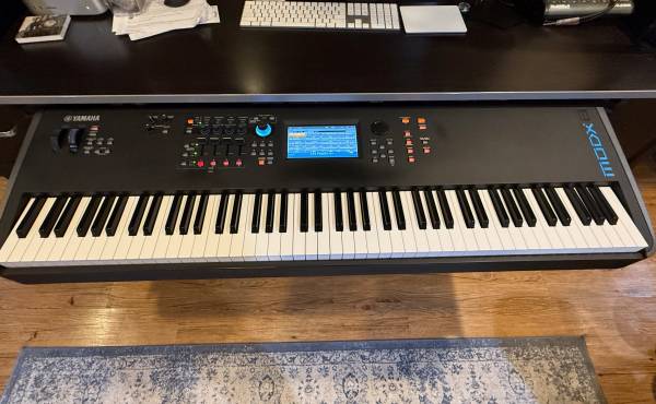 The Yamaha MODX8 is an 88-key synthesizer featuring a GHS weighted keyboard, Motion Control Synthesis Engine with AWM2 and FM-X tone generators, 128-note stereo AWM2 polyphony, and 64-note FM-X polyphony. It has 5.67 GB of preset wave ROM and 1.75 GB of flash ROM, a 7-inch color touchscreen, and a built-in USB audio interface. The synth also includes a variety of effects, a Super Knob for simultaneous parameter control, and a comprehensive set of physical connections.