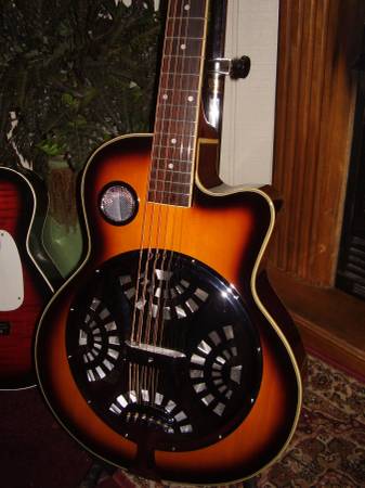 Acoustic/electric resonator guitar with round neck, finished frets, new strings and set up to be very playable. Upgraded electronics works and sounds sweet.. $275 cash/carry. Will not ship. If it's...