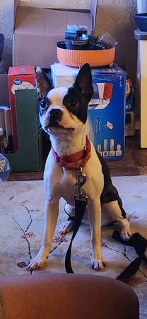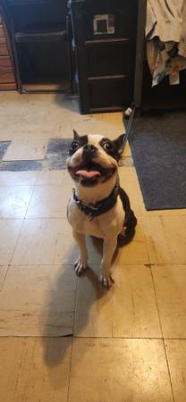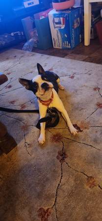 Pearl - 1 yr old Boston Terrier, not spayed, up to date on Rabies and Distemper vaccines, on flea and tick prevention. Loves sitting in a lap, chewing sticks, and chasing balls. Gets along with kids, cats, and dogs. Will come with food for transition as well as leash and collar. *sister to Gypsum*