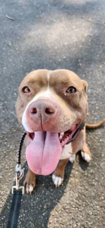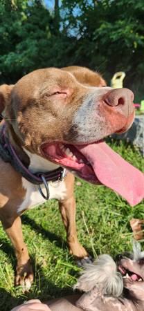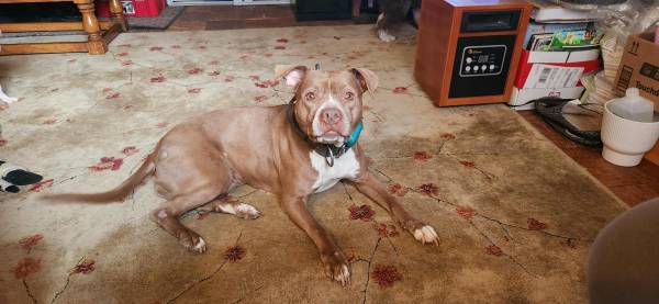 Hazel - 7 year old female pit, spayed, up to date on rabies and distemper vaccine, on flea and tick prevention. Loves people, enjoys being a couch potato and squeaky toys. Gets along with kids, cats, and dogs. Will come with food for transition as well as leash and collar.