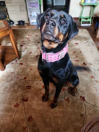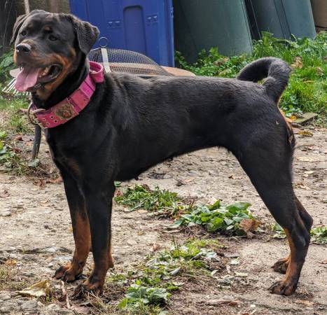 Samara - 4 yr old Rottweiler, spayed, up to date on Rabies and Distemper vaccines, on flea and tick prevention. Loves people, running around the yard, cuddling on the couch. Gets along with kids, cats, and dogs. Will come with food for transition as well as leash and collar.