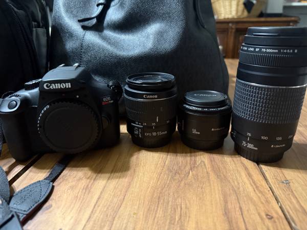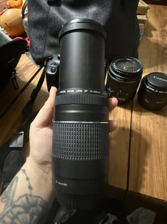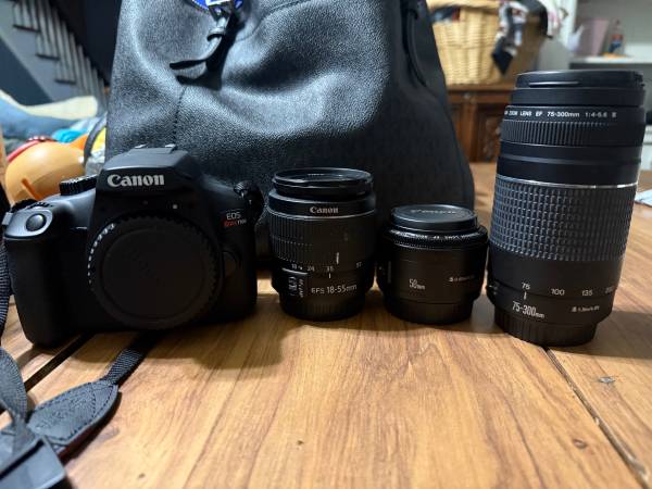 Decent condition works great just not into photography anymore and don’t have time for photography anymore sadly. Comes with the stock 18-55mm lens, 50mm 1:1:8 lens, and the Canon Zoom lens EF 75-300mm 1:4-5.6. Also comes with one battery and 2 chargers a phone mount for on top of the camera, and a SD card holder