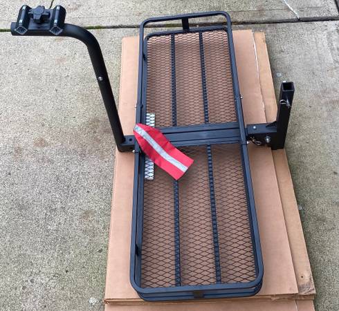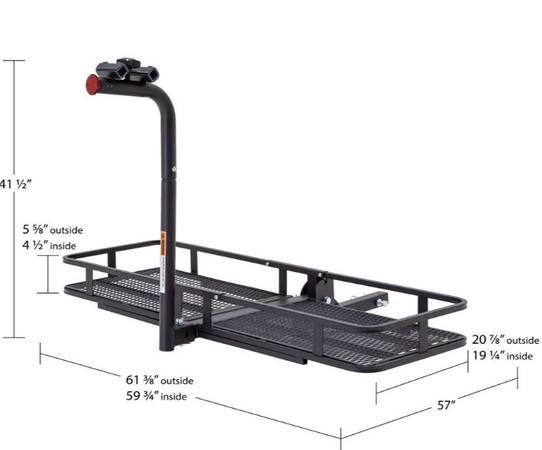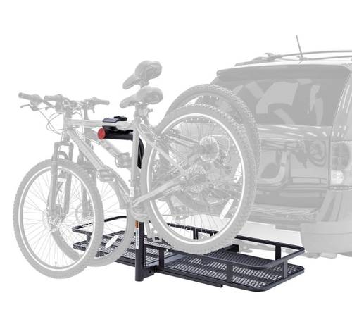 This Elevate Outdoor Cargo Carrier comes with a 2-bike rack so that you no longer have to choose between bikes or items - you can transport them all at once! Manufactured from powder-coated steel, this carrier has a 400-pound weight capacity, and the 2-bike rack can support two bikes weighing a combined total of 80 pounds. The bike rack arm can be removed entirely or rotated 90 degrees and installed horizontally if you aren't transporting your bikes or want to store the carrier compactly. When the bike rack arm is removed or installed horizontally, the carrier can be folded up to reduce your vehicle's footprint. Rubber cradles on the bike rack attachment securely hold bikes without scratching the frames.