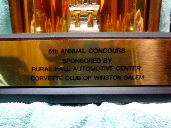 1980 Corvette Club of Winston Salem , wood with gold accent , Corvette on top 24 in tall , 10in wide at base , very nice $15.00 Text or Call