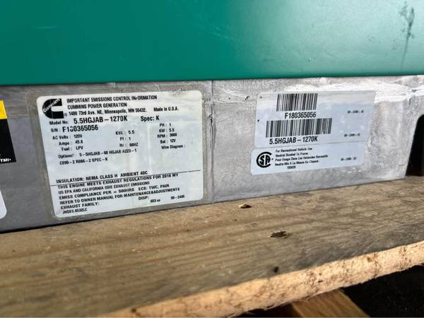 5500 Onan generator with 6.3 hours. Comes with exhaust, transfer switch and interior control panel. Very good condition, on skid and can be shipped.