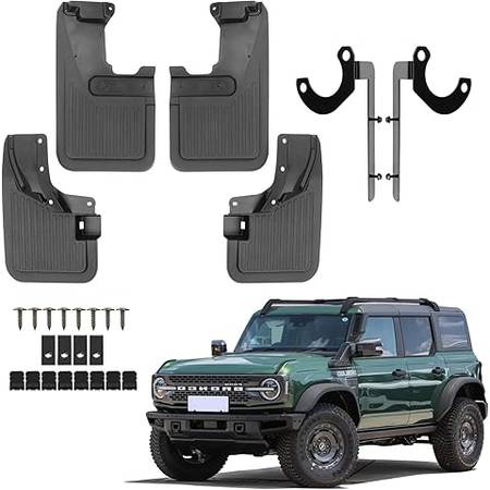 Listed is a set of 4 heavy-duty mud flaps (NEW) for the 2021-25 Ford Bronco models. These are a plastic molded set OEM Equivalent design for the new Bronco models (Ex. Sasquatch, Wildtrak & First Edition models). Direct bolt-on and includes the hardware to install. Anti-Crack & UV-Stabilized for long term Durability. Will ship these if paid in advance thru PayPal or meet in my local Butler area for pickup.