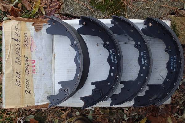 Rear brake shoes and hardware for a Dodge Ram 2500 pickup truck.