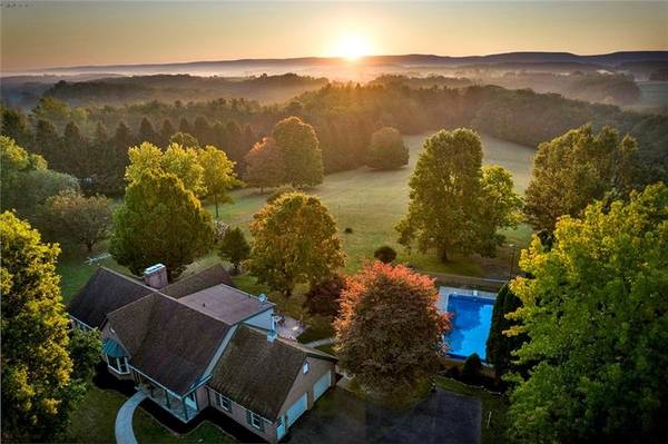 Amazing Laurel Sunrises! 4 BR 3-1/2 bath (22) acre Estate! Private back patio adjoins Kitchen & Great Room. Wildlife abounds - a bird sanctuary. Bluebird boxes await the next season! Garden areas with a Gazebo. Several outdoor yard faucets to water plants & flowers. Heated 22 x 42 Salt Water Swimming Pool with beautiful fenced-in patio & lawn. Lit Bocci Court & Horseshoe Pits. Large Eat-In Kitchen w Island, 2 sinks, and loads of cabinets. First floor Laundry with a pantry cupboard. Primary Bedroom Suite with a walk-in closet, wood-burning Fireplace, private Eastern Patio, spacious shower, private water closet, soaking tub, and double vanity await! Abundant sunlight in the 20x26 Great Room with dining area built in & huge wood-burning Fireplace. Natural Stone floor Entry Foyer leads to handsome Den/Office and 1/2 bath. Fully finished basement with Family Room, pellet stove, full Bath, large Bedroom with a walk-in closet. Oversized 2-car garage with workbench. Detached 3-car Barn/Garage w 1/2 Bath. Home Warranty!