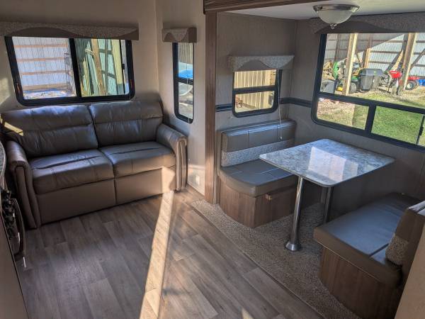 Nice travel trailer. Queen size bed, with storage underneath from the inside. Space to hang clothes on both sides of the bed. One side out which contains a table with bench seating on either side, with storage in each bench. A couch that opens to a full size bed. Kitchen has a refrigerator/freezer, 3 burner stove top, oven, microwave, and double bowl sink. Entertainment unit comes with TV, CD/DVD player. There is a large pass thru storage area in the front of the unit, with an additional smaller storage in the right rear side. Large power awning with LED lighting, exterior speakers, and outside shower. 2-20 lb propane tanks. This unit has had many miles of adventure, but still have many more left. When not in use, the Aspen Trail is stored in a shed. With hitch trailer is 28'.